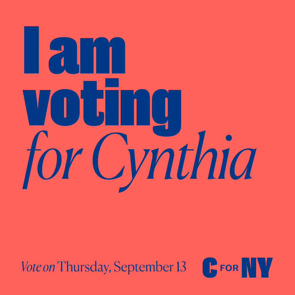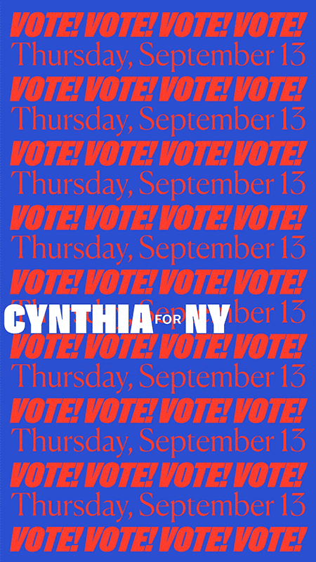 The visual identity reflects her unique voice, at times stepping outside the conventions of past politicians. Simple visuals leverage the messaging through purity of typography: Cynthia for New York is about ideas and the core principles of progressive change.